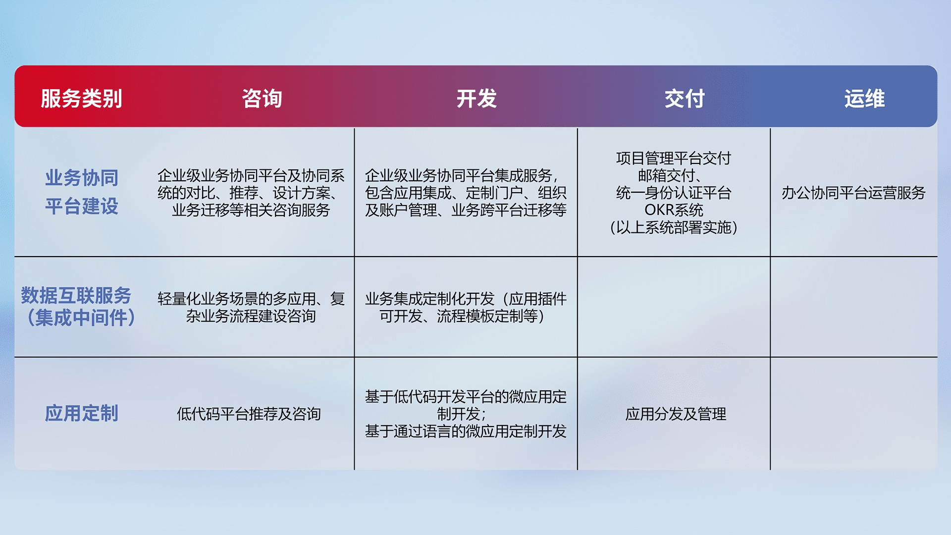 针对钉钉、、、、企微、、、IDaas等平台级产品提供产品的规划、、方案、、、、交付、、定制化开发等服务,,,,实现如统一协同办公、、、智能客户服务、、、、混合会议管理、、、、智能数据查询、、、等业务场景,,实现数字化转型。。。。