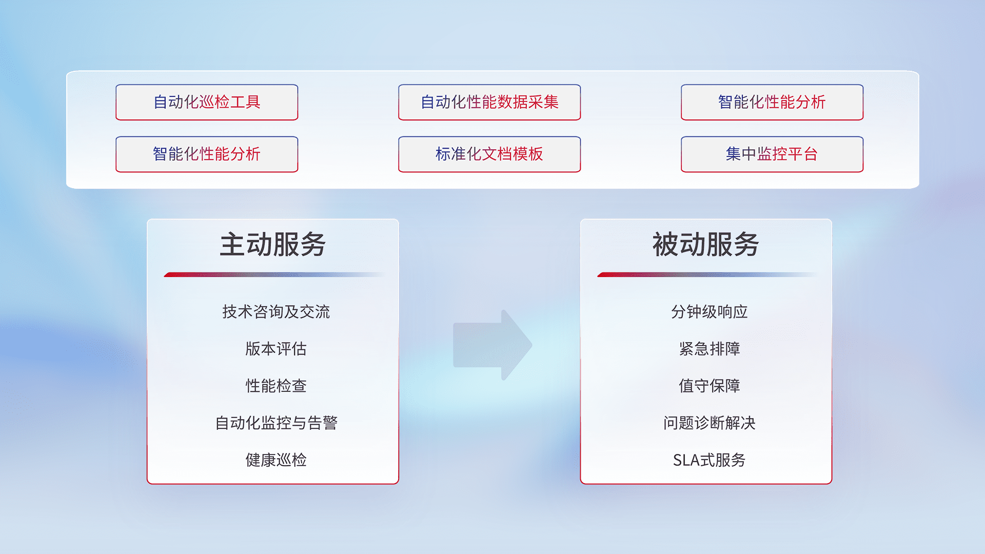 智能化工具和标准化文档,,,保障服务质量,,,,提供主动服务(包含技术咨询、、、、版本评估、、、、性能检查、、、自动化监控与告警、、、、健康巡检)和被动服务包含(分钟级响应、、、、紧急排障、、、、值守保障、、问题诊断解决、、、SLA服务)。。。